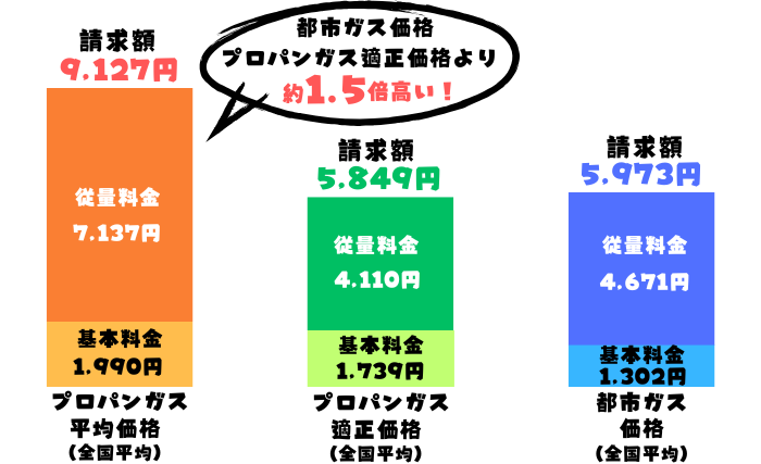 しかし、プロパンガスの平均価格は、都市ガスやプロパンガスの「適正価格」と比較すると1.5倍も高いケースが多いです。